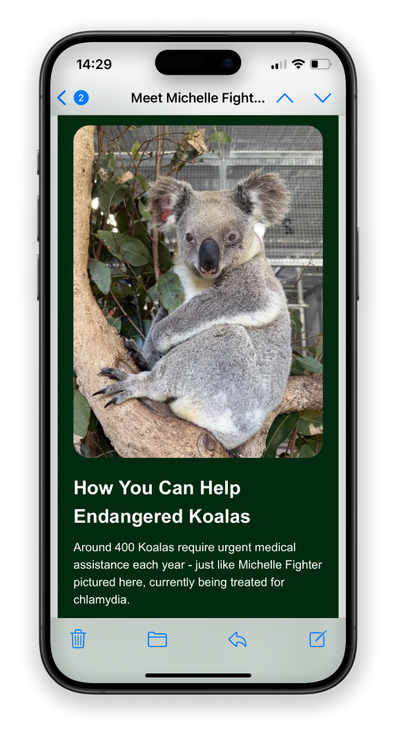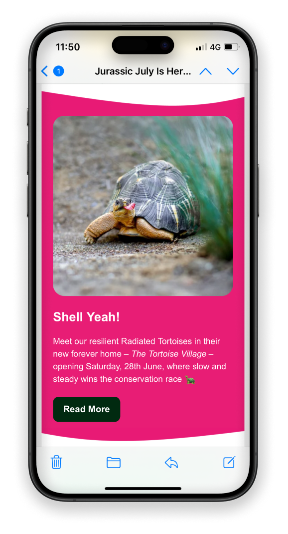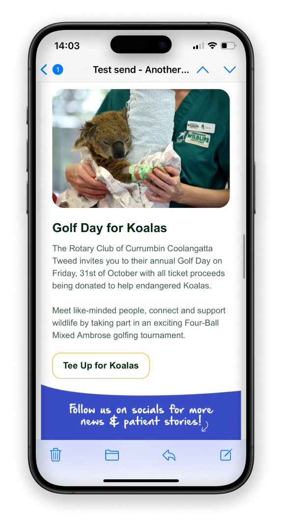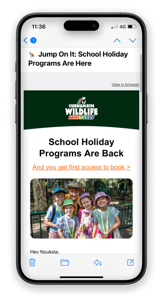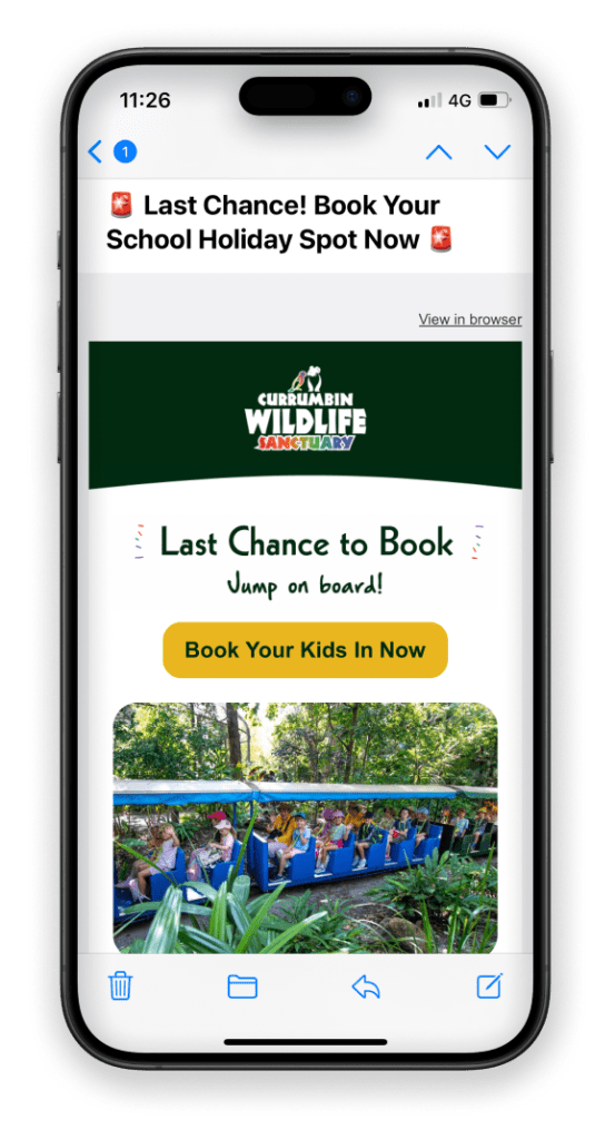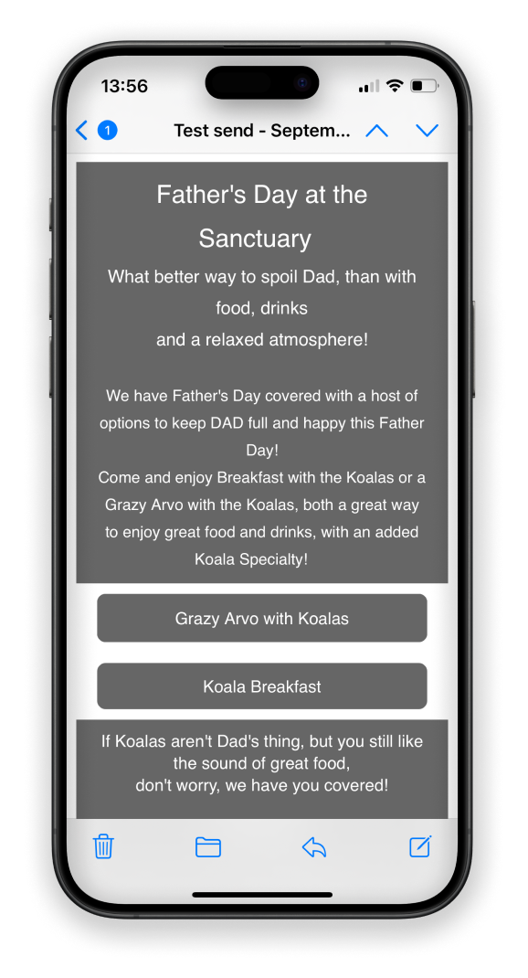 The statistics show that around 80% of our subscribers open their emails on their phone. So, creating a mobile-optimised design is crucial to ensure an enjoyable experience for readers. Of course, it still needs to look good on larger devices, but it’s always easier to upscale than the other way around. A mobile-first design would mean large buttons that are easy to click on, good spacing and break up large text blocks. And for ultra important messages, place them at the very top before scroll to get the message across.