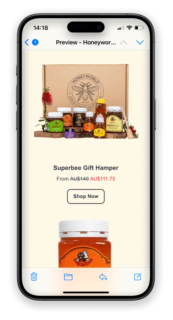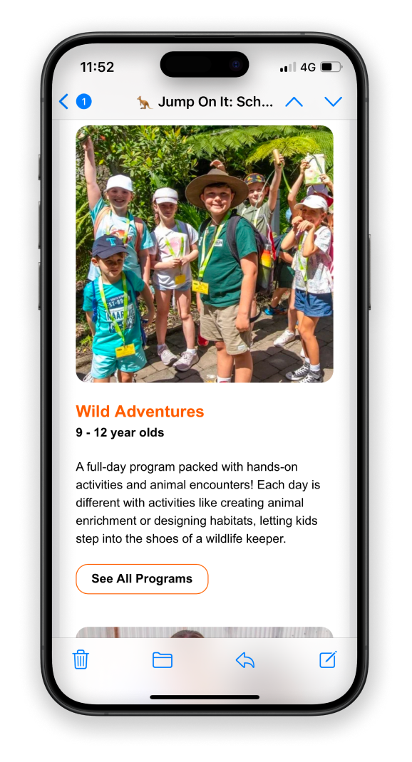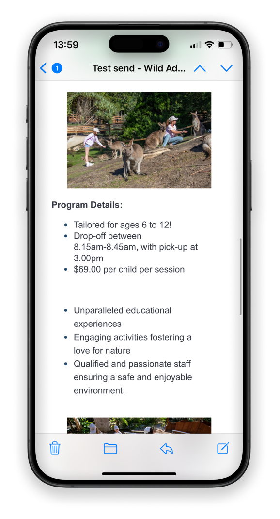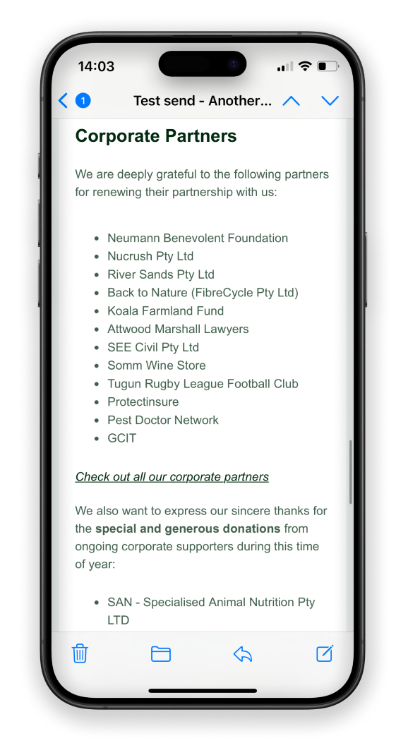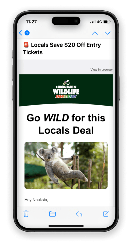 The statistics show that around 80% of our subscribers open their emails on their phone. So, creating a mobile-optimised design is crucial to ensure an enjoyable experience for readers. Of course, it still needs to look good on larger devices, but it’s always easier to upscale than the other way around. A mobile-first design would mean large buttons that are easy to click on, good spacing and break up large text blocks. And for ultra important messages, place them at the very top before scroll to get the message across.